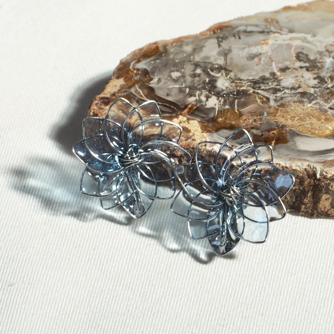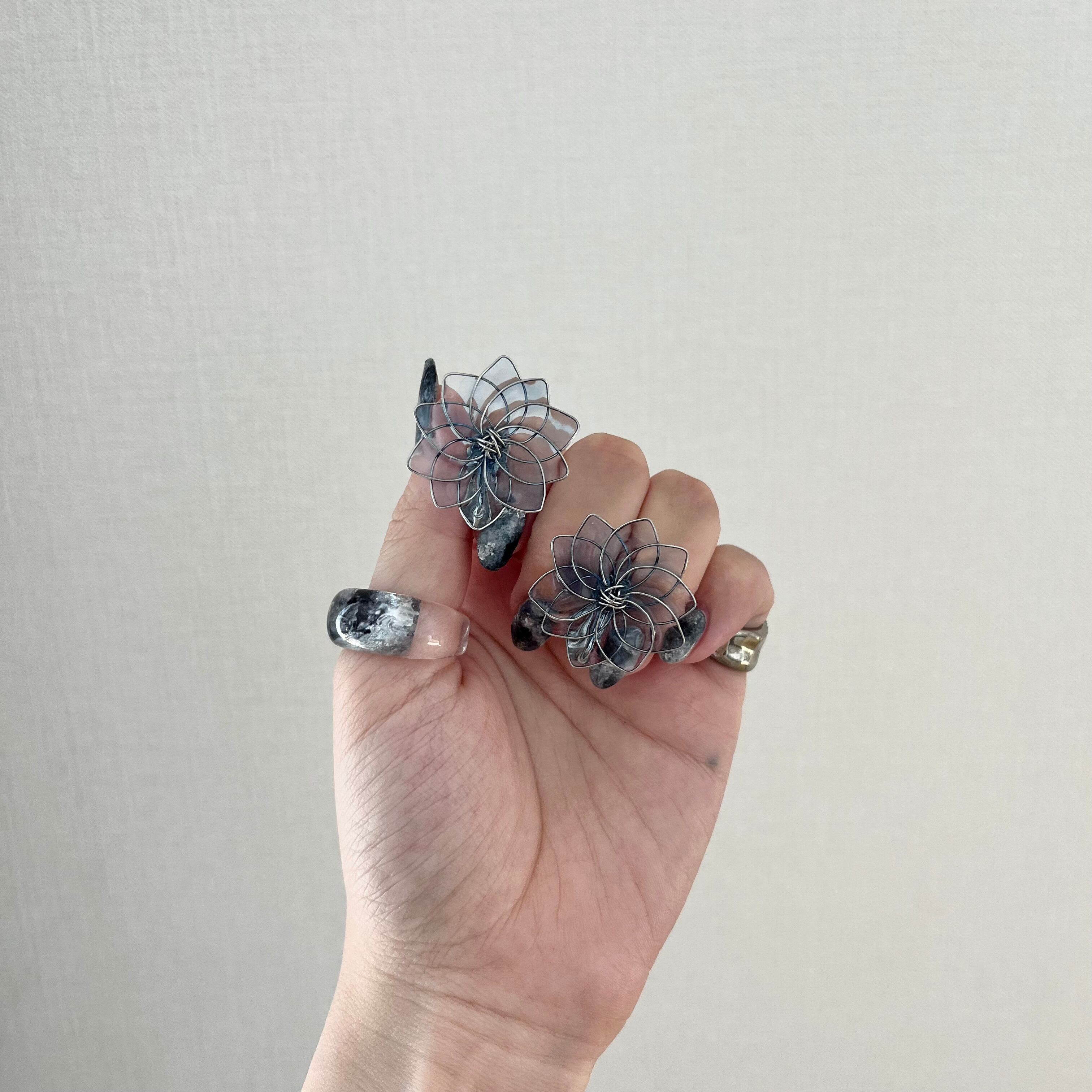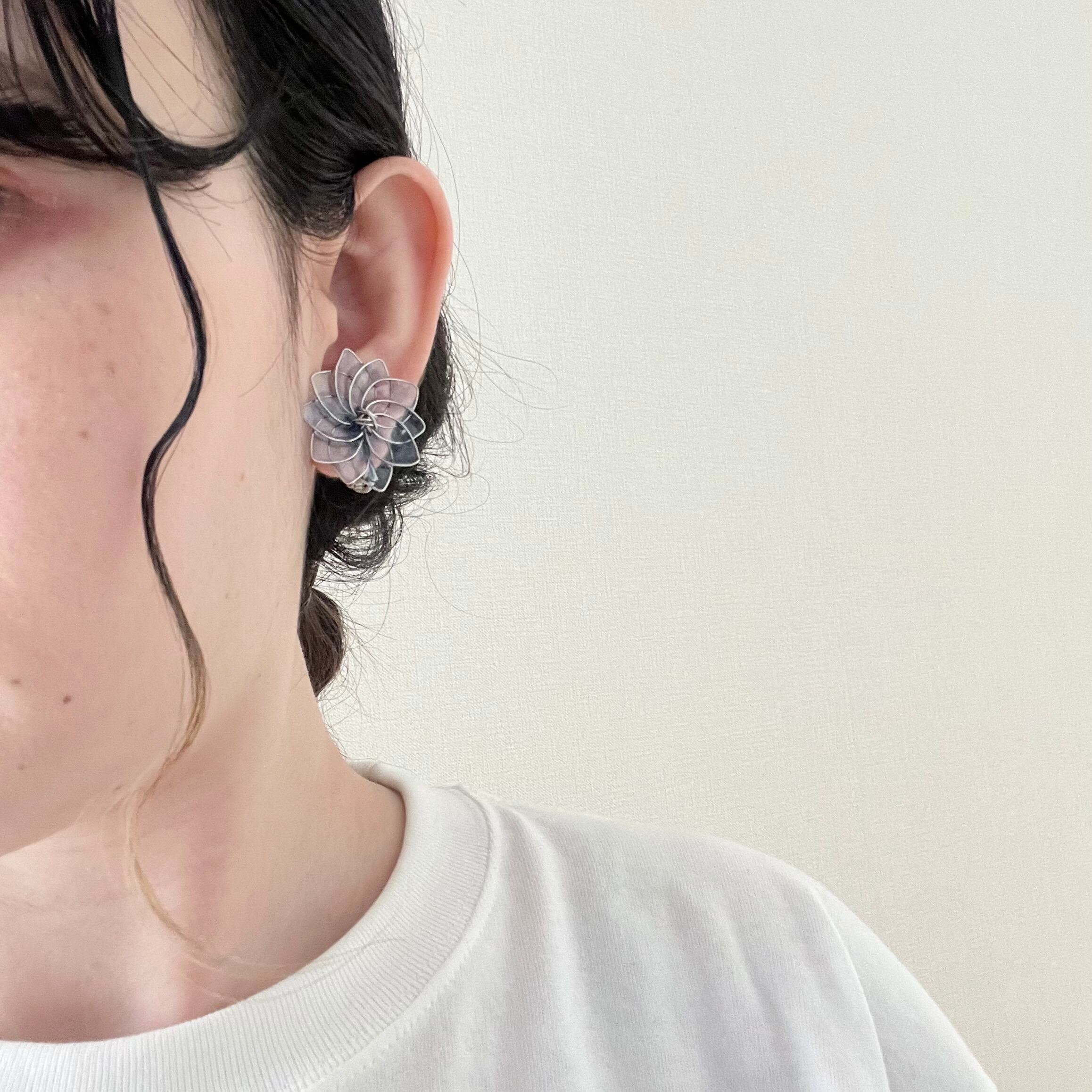 ▷ 手作りで作ったお花のモチーフにレジンを使ってクリア感を出した耳飾りとなっております。