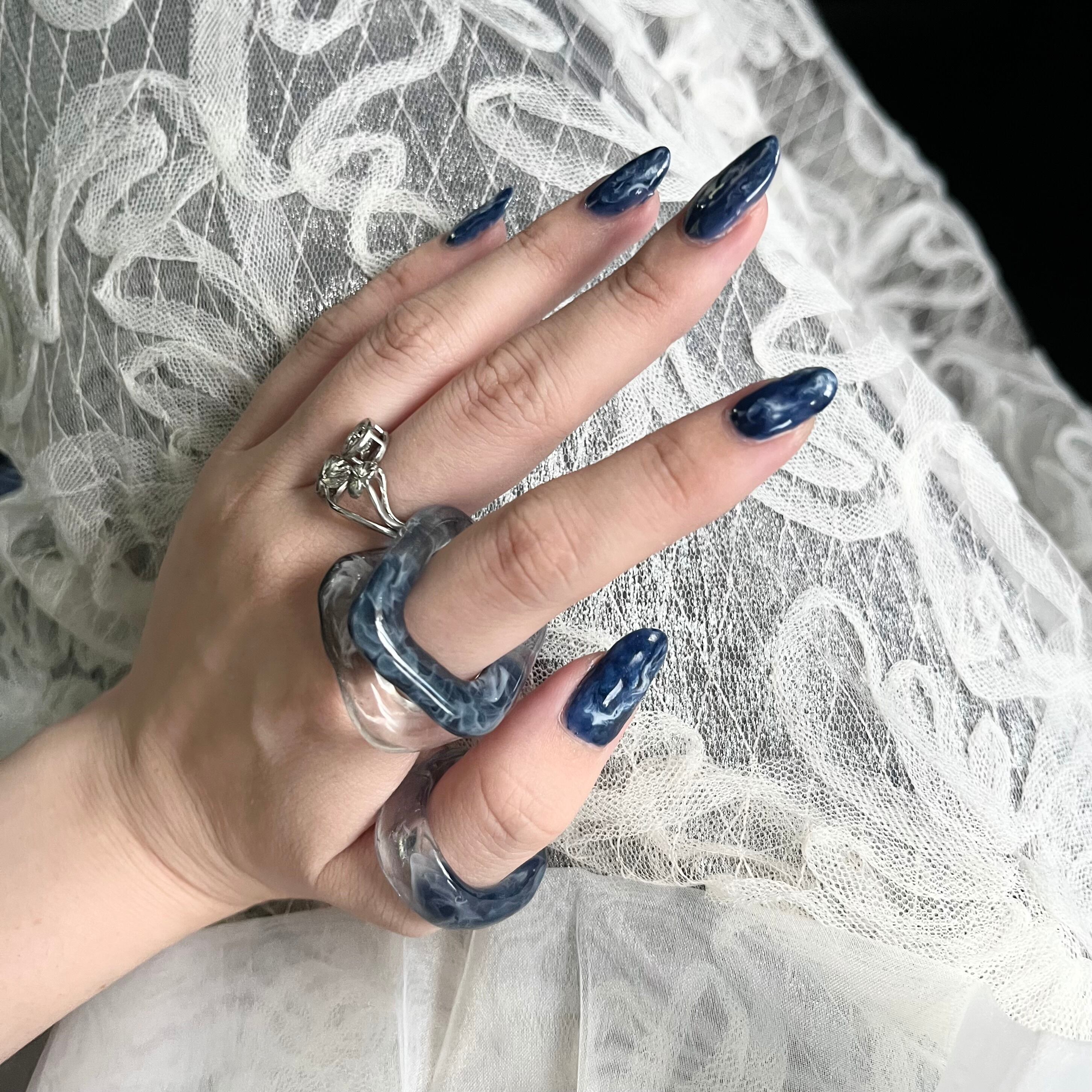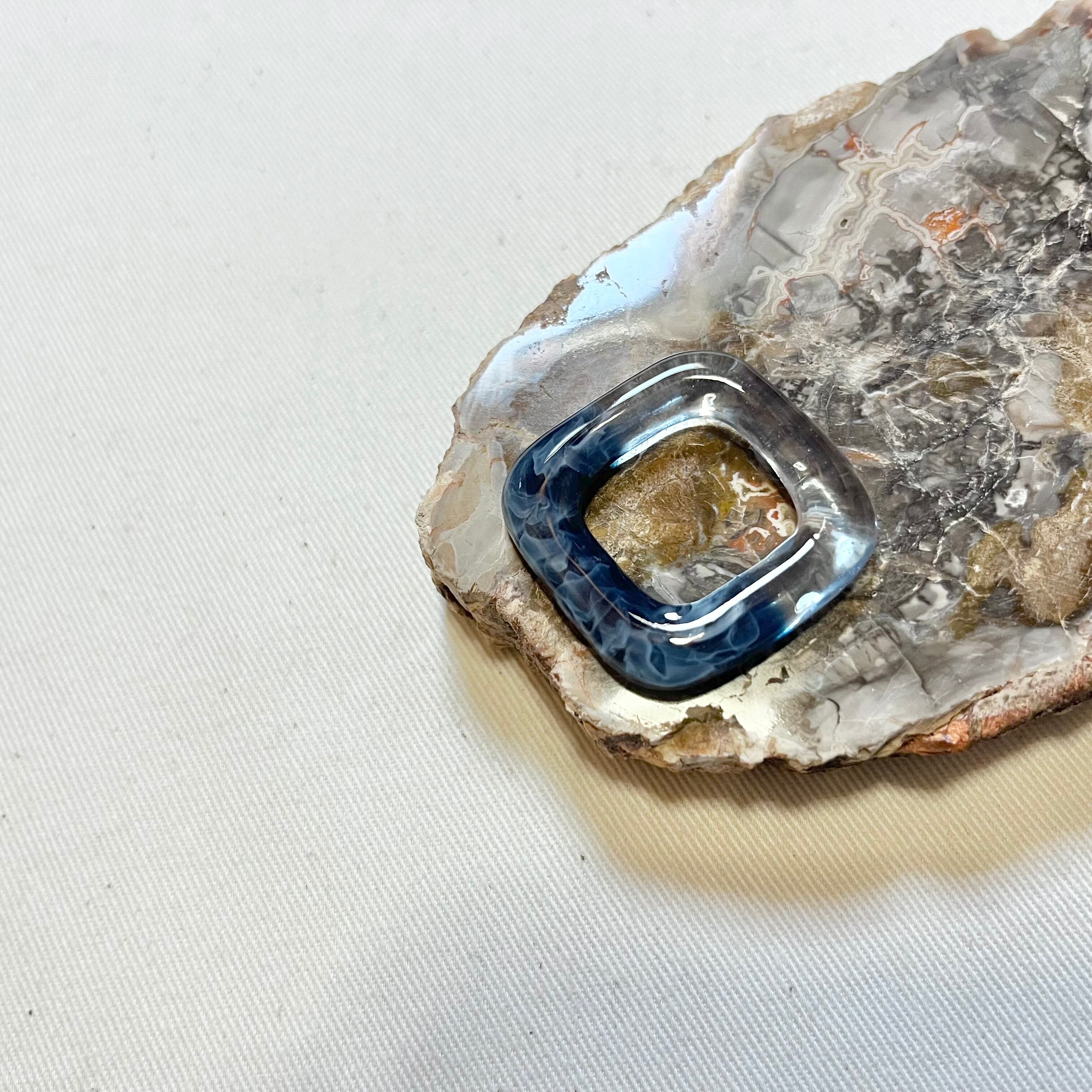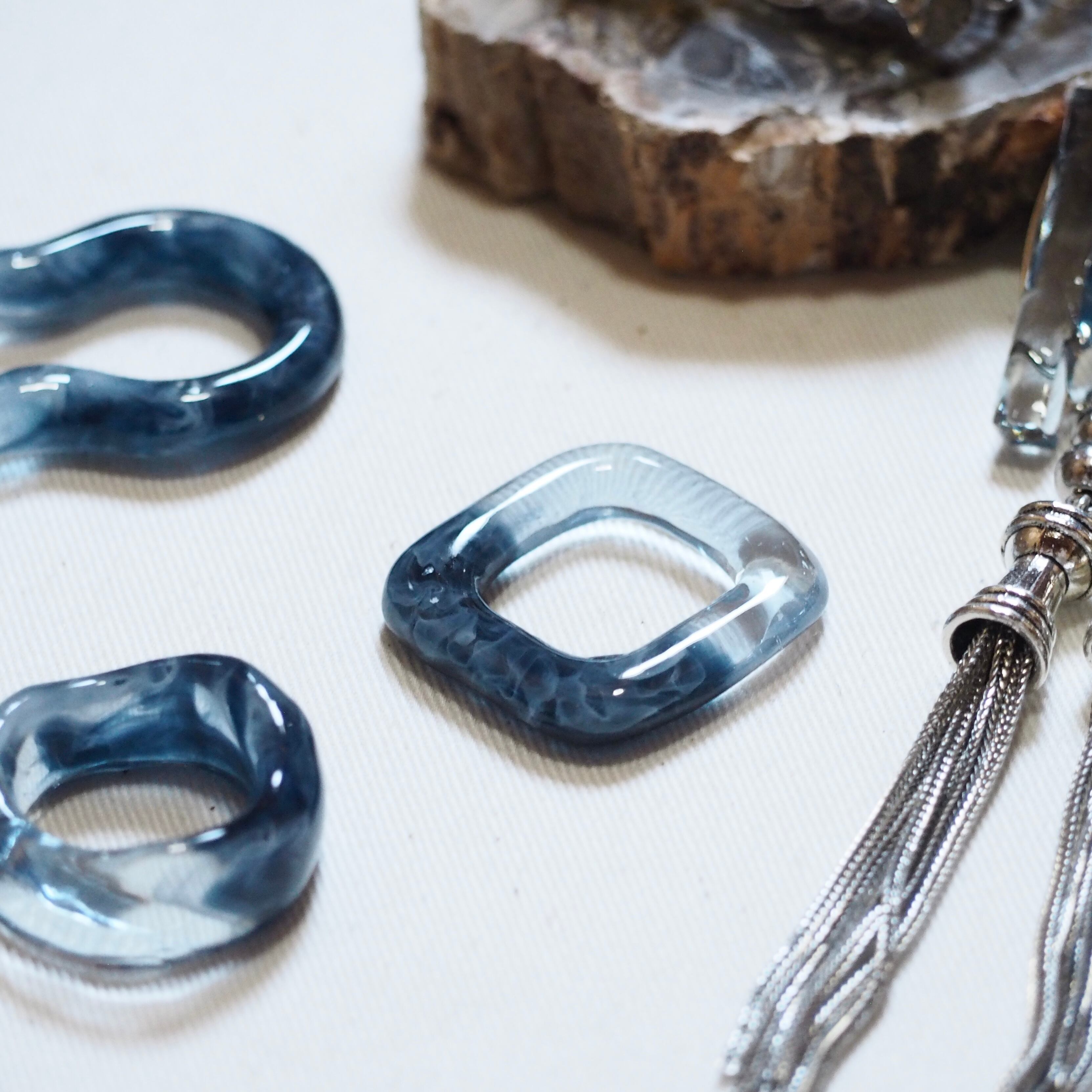 ▷ クリアカラー、ホワイトとブルーのマーブルが組合わさった四角いリングとなっております。